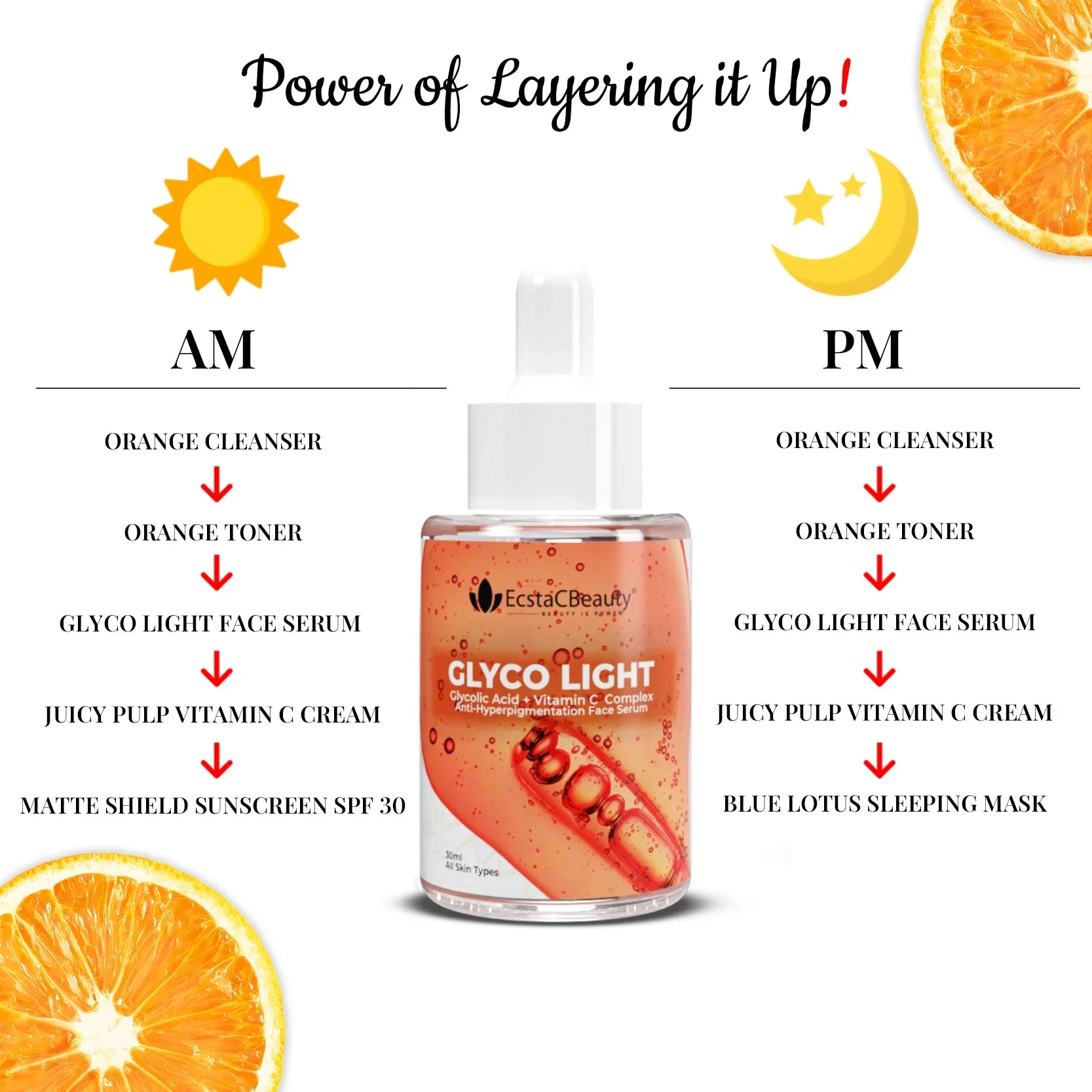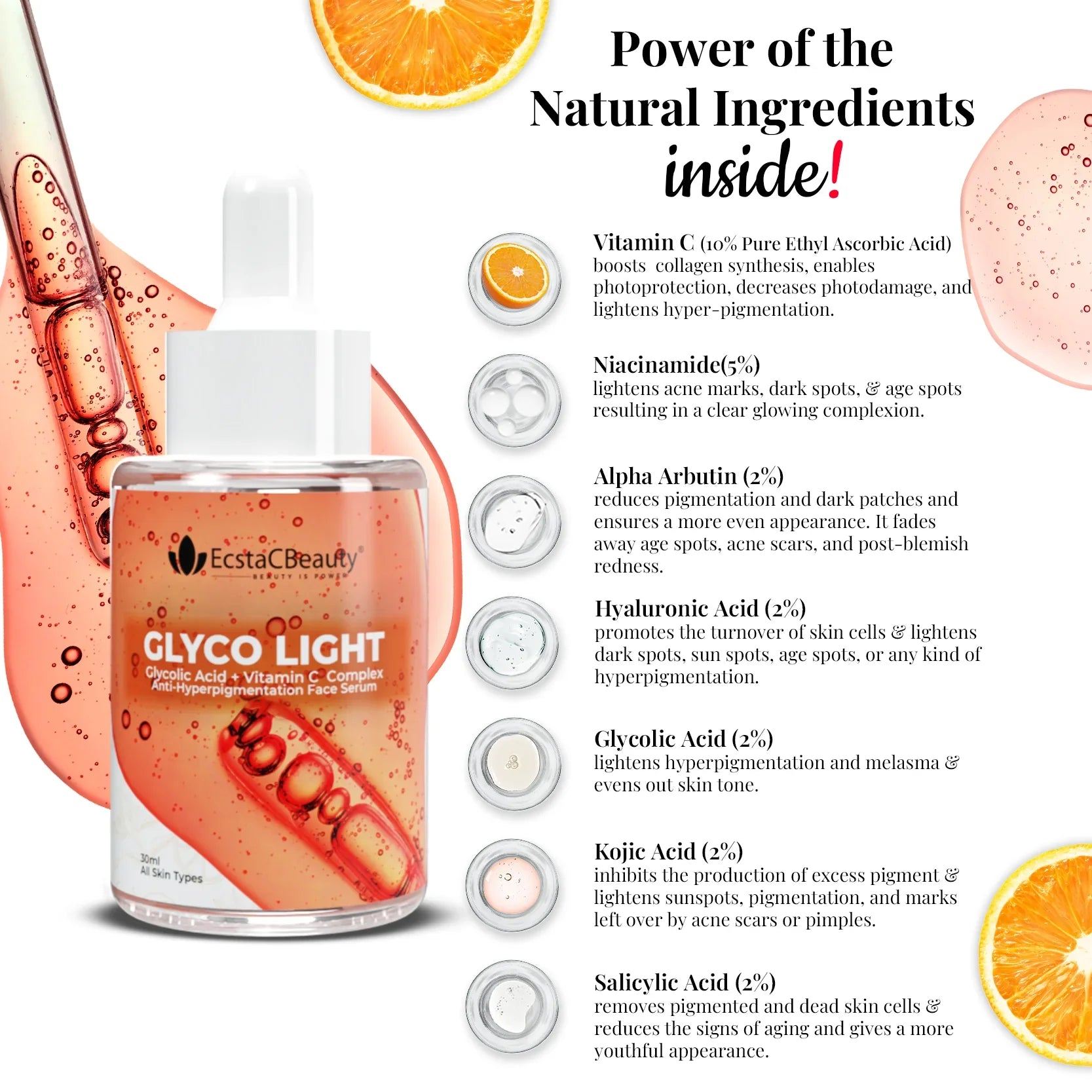 EcstaCBeauty Glyco Light Face Serum | Glycolic Acid & Vitamin C Complex | Exfoliating & Hydrating Formula | 100% Paraben & Toxin Free | All Skin Types (30ml)