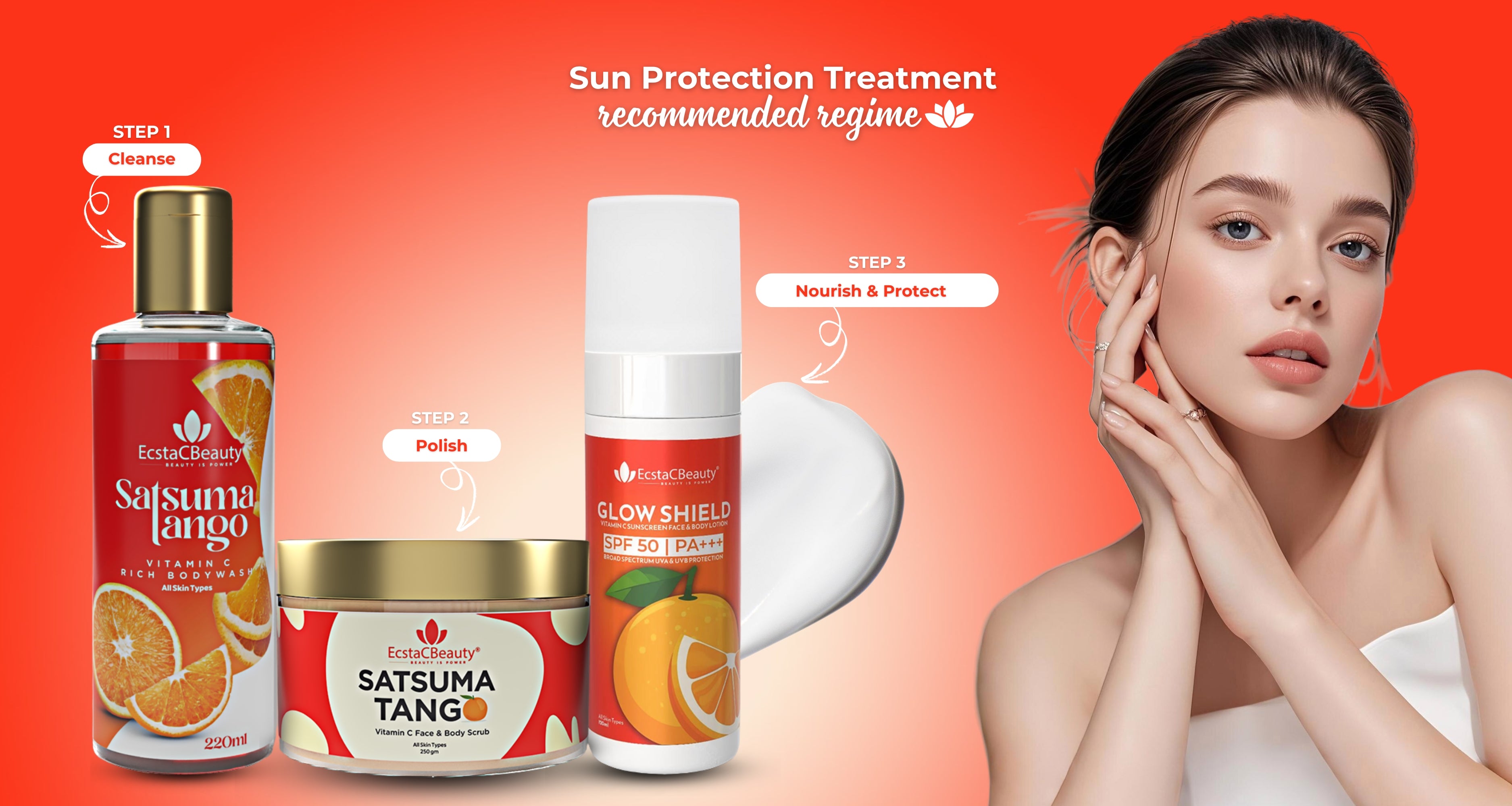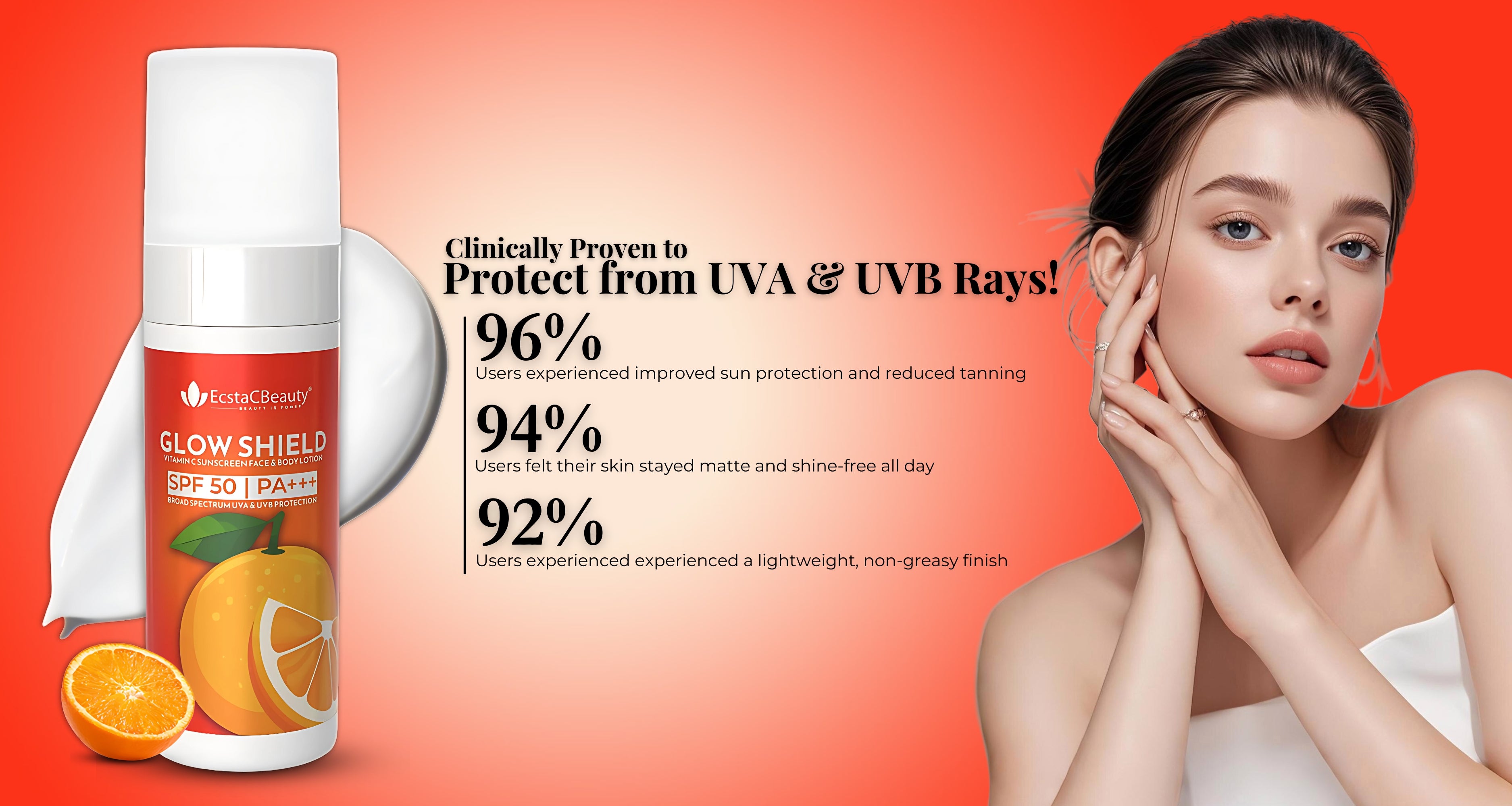 Glow Shield Vitamin C Sunscreen Face & Body Lotion SPF 50 PA++++ is your all-in-one daily sun protection and skincare essential, powered by 3% Ethyl Ascorbic Acid (Vitamin C) to brighten dull skin, 5% Niacinamide (Vitamin B3) to control oil and improve texture, and 0.5% Hyaluronic Acid for intense hydration. Formulated with micronized Zinc Oxide and Titanium Dioxide, this lightweight, non-greasy mineral sunscreen offers broad-spectrum protection against UVA, UVB, and blue light without leaving a white cast, even on deeper Indian skin tones. Infused with Vitamin E for antioxidant defense, it’s suitable for all skin types, including oily, sensitive, and acne-prone skin. Perfect for daily use on face and body, this non-comedogenic, fragrance-free sunscreen is ideal for Indian weather and helps prevent tanning, sunburn, pigmentation, and early signs of aging, making it the best sunscreen lotion for glow and protection in one.